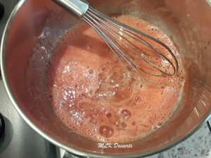 PrĂ©lever une petite quantitĂ© de coulis de fraises et le mettre dans une casserole et faites chauffer, puis hors du feu ajouter les 3 feuilles de gĂ©latine et mĂ©langer Ă l’aide d’un fouet jusqu’Ă ce qu’elle soit bien incorporĂ©. Verser le reste de coulis dans un saladier et y ajouter le mĂ©lange prĂ©cĂ©dent puis couper des petits morceaux de fraises et les ajouter dans le coulis de fraises. Laisser refroidir Ă tempĂ©rature ambiante.