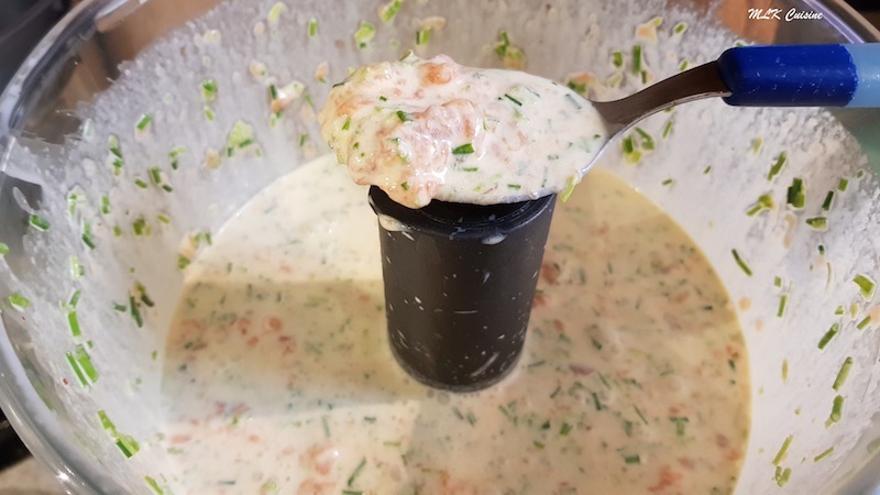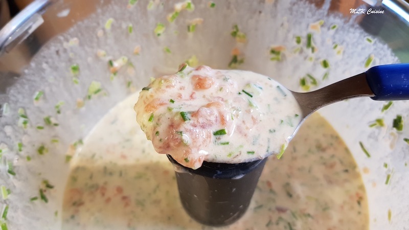 Mixer, sans pour autant réduire les ingrédients en bouilli. La texture doit être grumeleuse. On doit voir encore des petits morceaux de saumon.