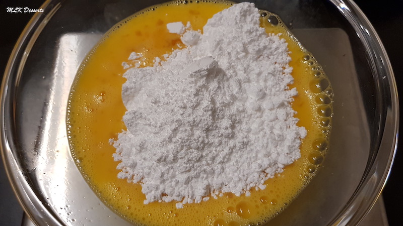 Dans un bol, battre les oeufs entiers, puis ajouter le sucre semoule, mélanger et ensuite ajouter le sucre glace et mélanger à nouveau à l’aide du fouet.