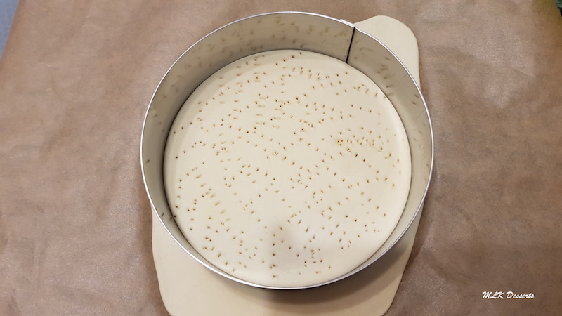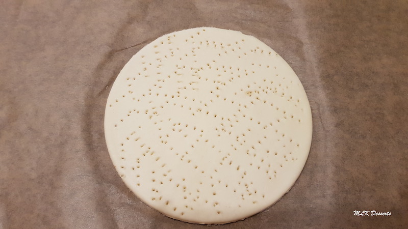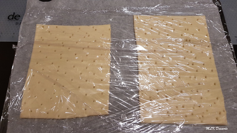 Si vous utilisez un rouleau de pâte feuilletée du commerce, réalisez cette étape le jour même. A l’aide d’un cercle de 24 cm de diamètre découper un disque dans la pâte feuilletée ou un rectangle, c’est au choix. Piquez-la à l’aide d’un pique-pâte ou d’une fourchette. Filmez-la et réservez-la au réfrigérateur au moins 30 minutes.