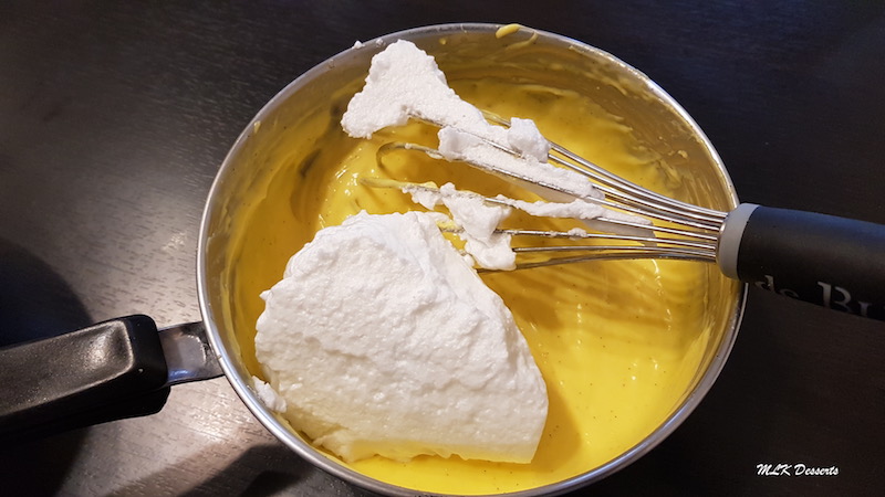 A présent nous allons détendre la crème pâtissière avec un peu de meringue française. Mélanger vivement à l’aide d’un fouet puis incorporer le reste de la meringue et remuer très délicatement.