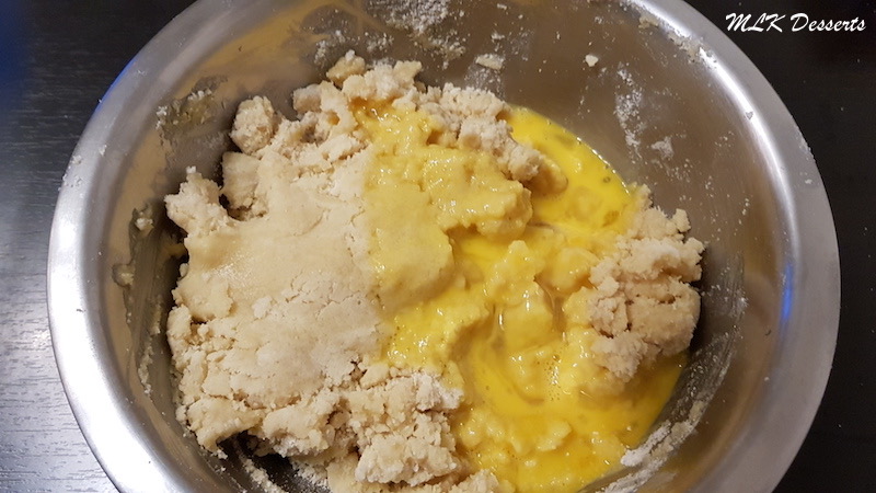 Ajouter le beurre mou coupĂ© en cubes et mĂ©langer du bout des doigts jusqu’Ă obtenir une poudre. Incorporer les Ćufs entiers lĂ©gĂšrement battus et mĂ©langer Ă nouveau jusqu’Ă obtenir une pĂąte homogĂšne. Former une boule et filmez-la en l’aplatissant lĂ©gĂšrement et rĂ©servez-la au rĂ©frigĂ©rateur pendant 15 minutes.