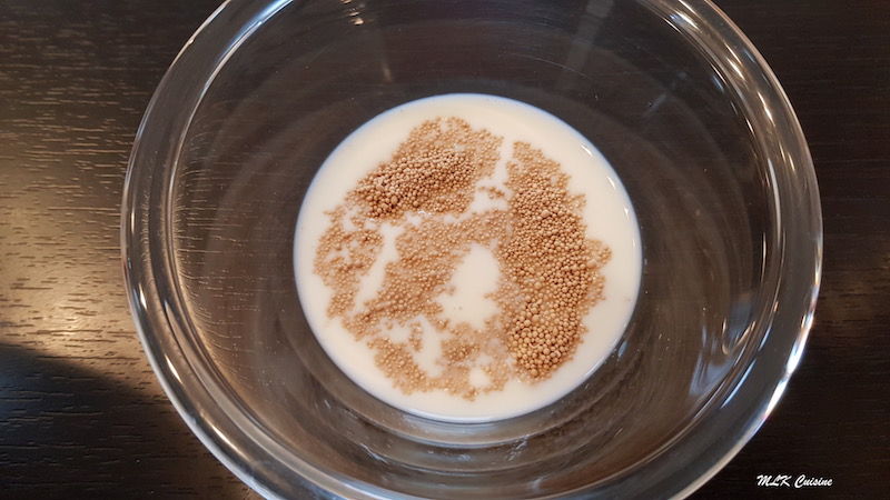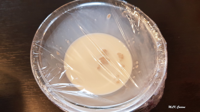 Dans un petit bol, commencer par réhydrater la levure dans un peu de lait tiède que vous prélevez des 150 ml et ajouter une pincée de sucre que vous prélevez des 15 g. Laissez reposer 15 minutes en filmant le petit bol.