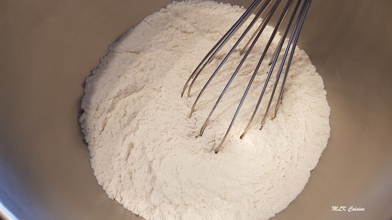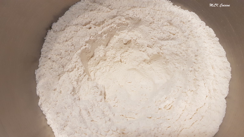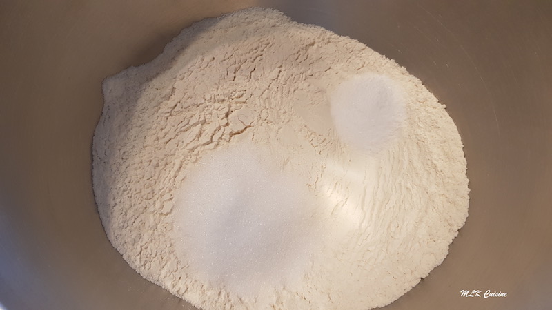 Mettre la farine, le sel et le sucre dans la cuve du robot et mélanger le tout à l’aide d’une fouet.