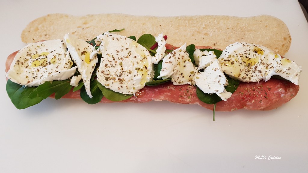 Une fois vos panini bien refroidi, coupez-les en deux dans le sens de la longueur et garnissez-les selon vos goûts. Pour moi, un panini jambon blanc Italien, mozzarella di Bufala, tomate et origan d’Italie et un panini salami italien, mozzarella di Bufala, tomate, origan d’Italie, salade et un filet d’huile d’olive d’Italie.
