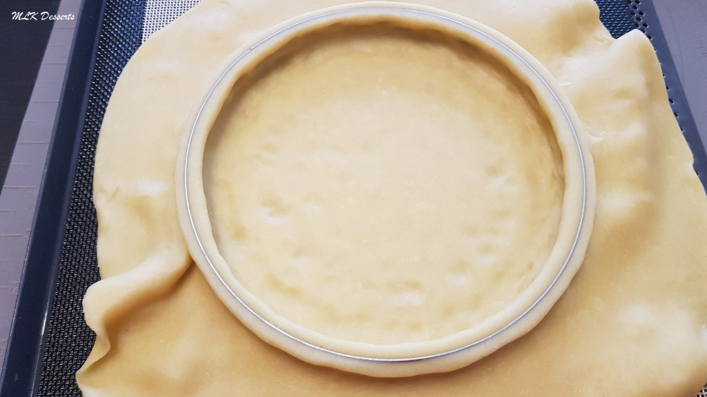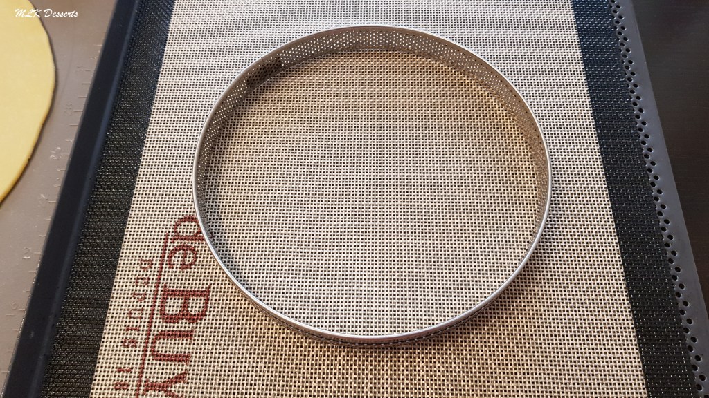 Prendre votre cercle à tarte et déposez-le sur une plaque à pâtisserie perforée recouverte d’un tapis de cuisson siliconé ou une feuille de papier cuisson.