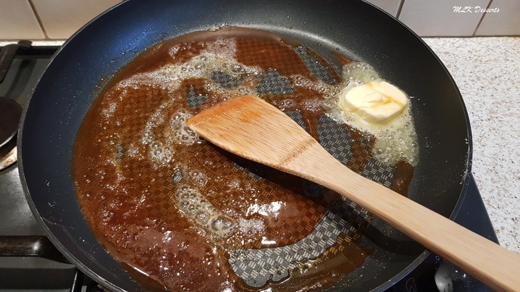 Placer une poêle sur feu doux. Verser un tiers du sucre, puis faites chauffer doucement, jusqu’à obtention d’un caramel blond. Remuer avec une cuillère en bois.