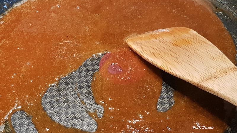 Ajouter le restant du sucre, puis poursuivre la cuisson jusqu’à obtenir une couleur ambrée. Ça peut pendre entre 5 à 10 minutes. Bien surveiller la cuisson du caramel.