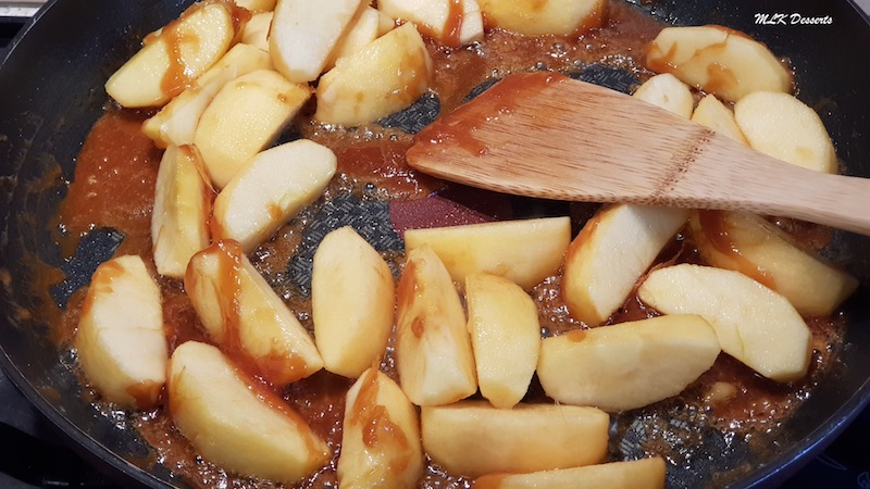 Quand les pommes commencent à rendre du jus, verser le calvados. Faites cuire 4 à 5 minutes à feu doux. Réserver.