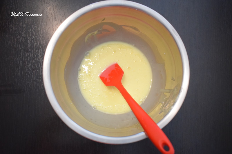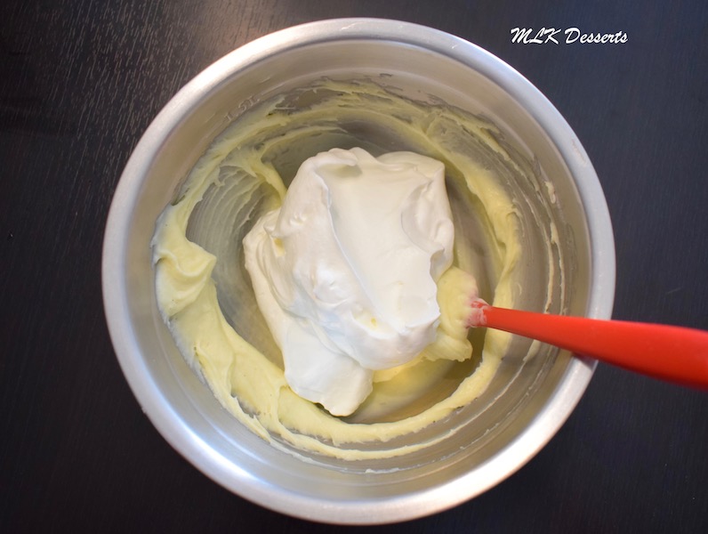 Une fois le mélange incorporé à la meringue, prélever une bonne grosse cuillère de meringue et ajoutez-la au beurre fondu. Mélanger le tout à l’aide de la maryse.