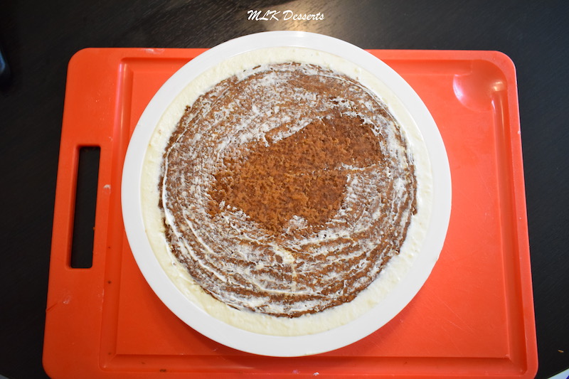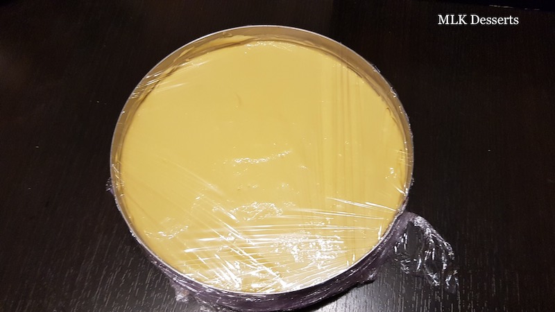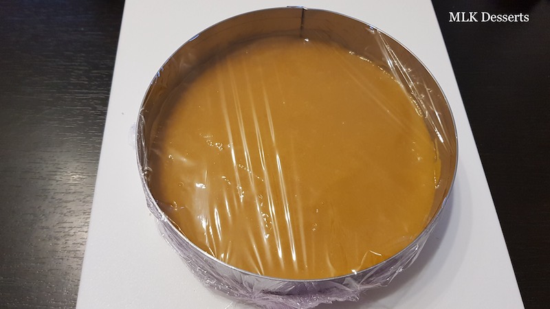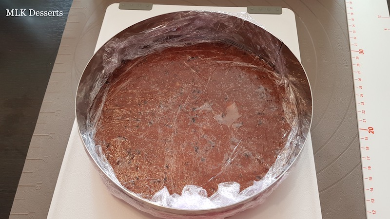 Déposer la dacquoise dans le fond du cercle de 16 cm de diamètre, que vous aurez filmer au préalable à l’aide d’un film alimentaire, si la dacquoise est légèrement plus grande, détaillez-la à l’aide du cercle de 16 cm de diamètre. Réserver de coté jusqu’à son utilisation.