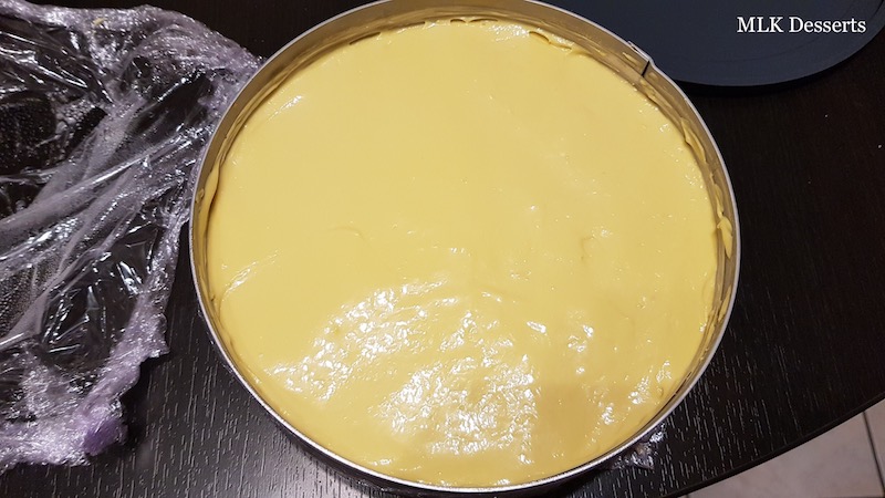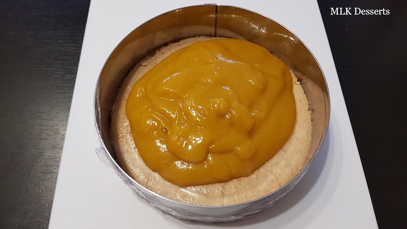 Sortir votre insert, dacquoise + confit de fruit de la passion du congélateur et couler sur le confit votre crémeux et à l’aide d’une spatule coudée étalez-le afin d’avoir une surface bien plane.