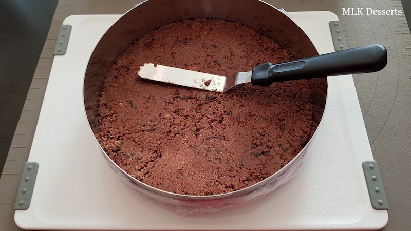 A l’aide de 2 grandes palettes inox que vous placez sous l’entremet, faites-le glisser délicatement puis soulevez-le et déposer délicatement l’entremet sur le disque de crumble en le centrant.