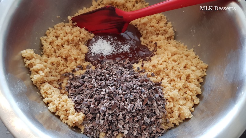 Mettre le crumble dans un bol et réduisez-le en miettes, puis ajouter le chocolat fondu, la fleur de sel et le grué de cacao, mélanger le tout à l’aide d’une maryse.