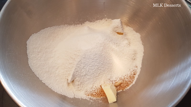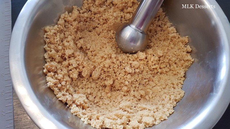 Mettre dans la cuve du robot, le beurre froid, le sucre cassonade, la poudre de noisette et la farine tamisée, mélanger le tout à l’aide de la feuille jusqu’à obtenir une texture de crumble.