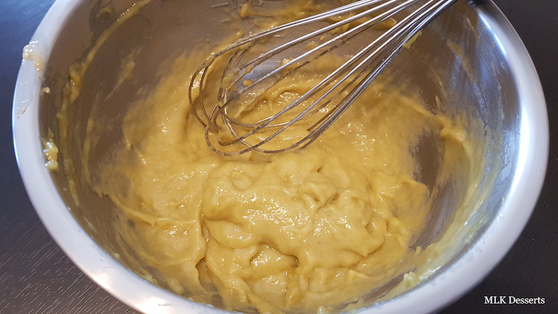 Ajouter les 45 à 50 g d’œuf entier battu légèrement en omelette au fur et à mesure tout en mélangeant à la spatule en créant une émulsion à chaque ajout. Ajouter la poudre d’amandes et pour ne pas changer, mélanger à nouveau toujours à l’aide de la spatule. Vous obtenez une crème bien homogène.