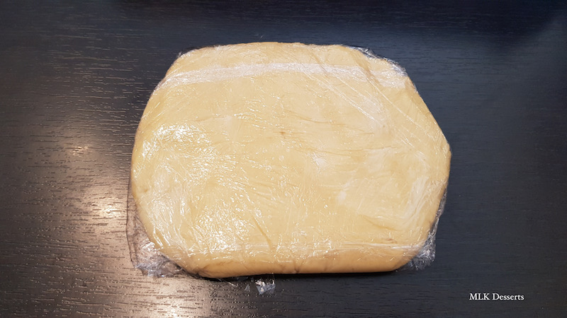 A l’aide de la paume de la main, fraser la pâte pour bien l’homogénéiser. Former une boule, déposez-la sur un film alimentaire et aplatissez-la légèrement et réservez-la au réfrigérateur pendant 2 heures en la filmant correctement.