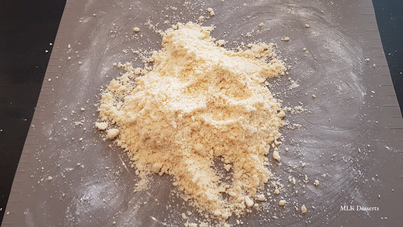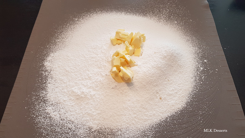 Ajouter le beurre froid coupé au préalable en morceaux et commencer à mélanger du bout des doigts. Mélanger jusqu’à obtention d’une texture sableuse.