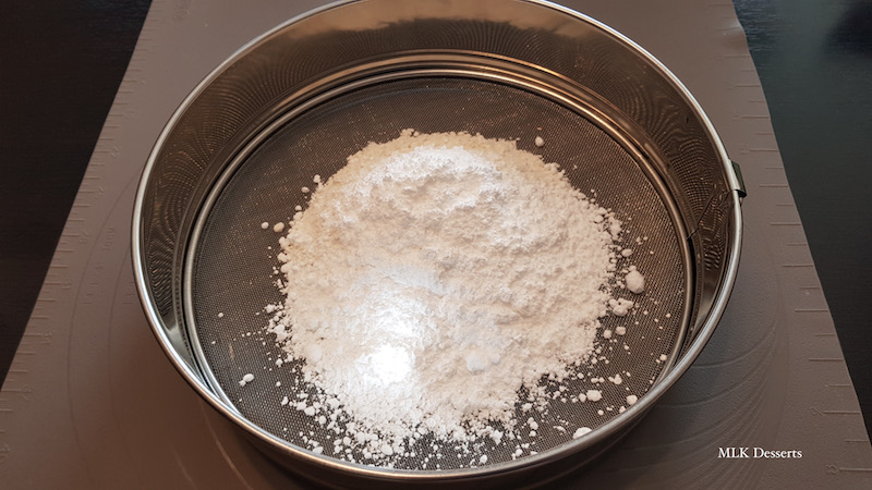 Sur votre plan de travail, tamiser la farine et le sucre glace ensemble à l’aide d’un tamis.