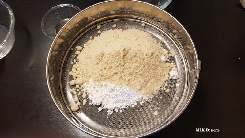 Tamiser ensemble la poudre d’amandes et le sucre glace.