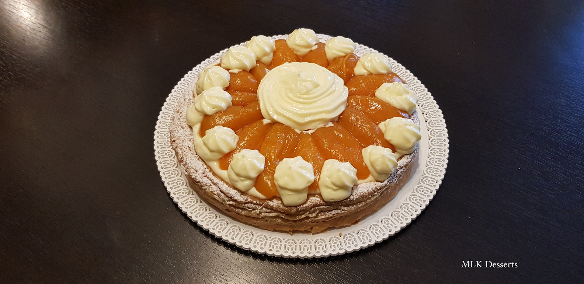 Déposer vos quartiers d’abricots sur la crème puis pocher avec le reste de crème une rosace au centre et sur les bords, le mien laisse à désirer 😁 (vous faites le pochage que vous souhaitez).