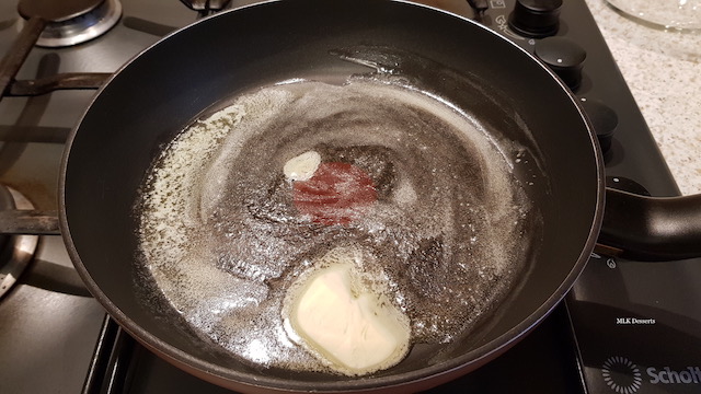 Dans une poêle chaude, ajouter les 20 g de beurre et laissez-le fondre. Ajouter les quartiers de pommes et cuire rapidement sur feu moyen à vif.