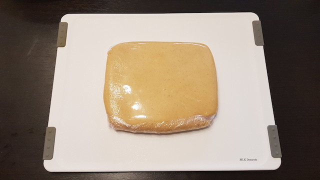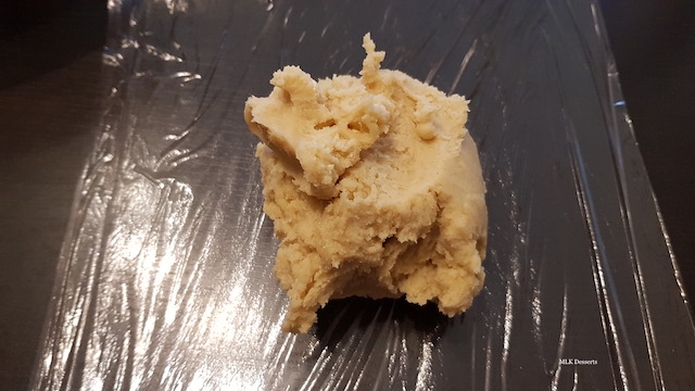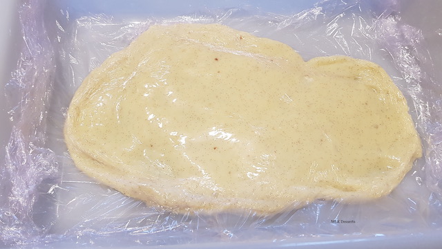 Une fois que le mélange faine + levure chimique sont incorporés, débarrasser sur un film alimentaire et filmez-la. Réserver au réfrigérateur pendant 24 h.