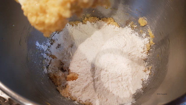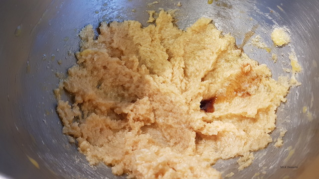 Ensuite incorporer petit à petit en filet l’œuf entier battu puis la vanille. Dès que le mélange est homogène, incorporer la farine et la levure chimique que vous avez au préalable mélangé et tamisé ensemble.