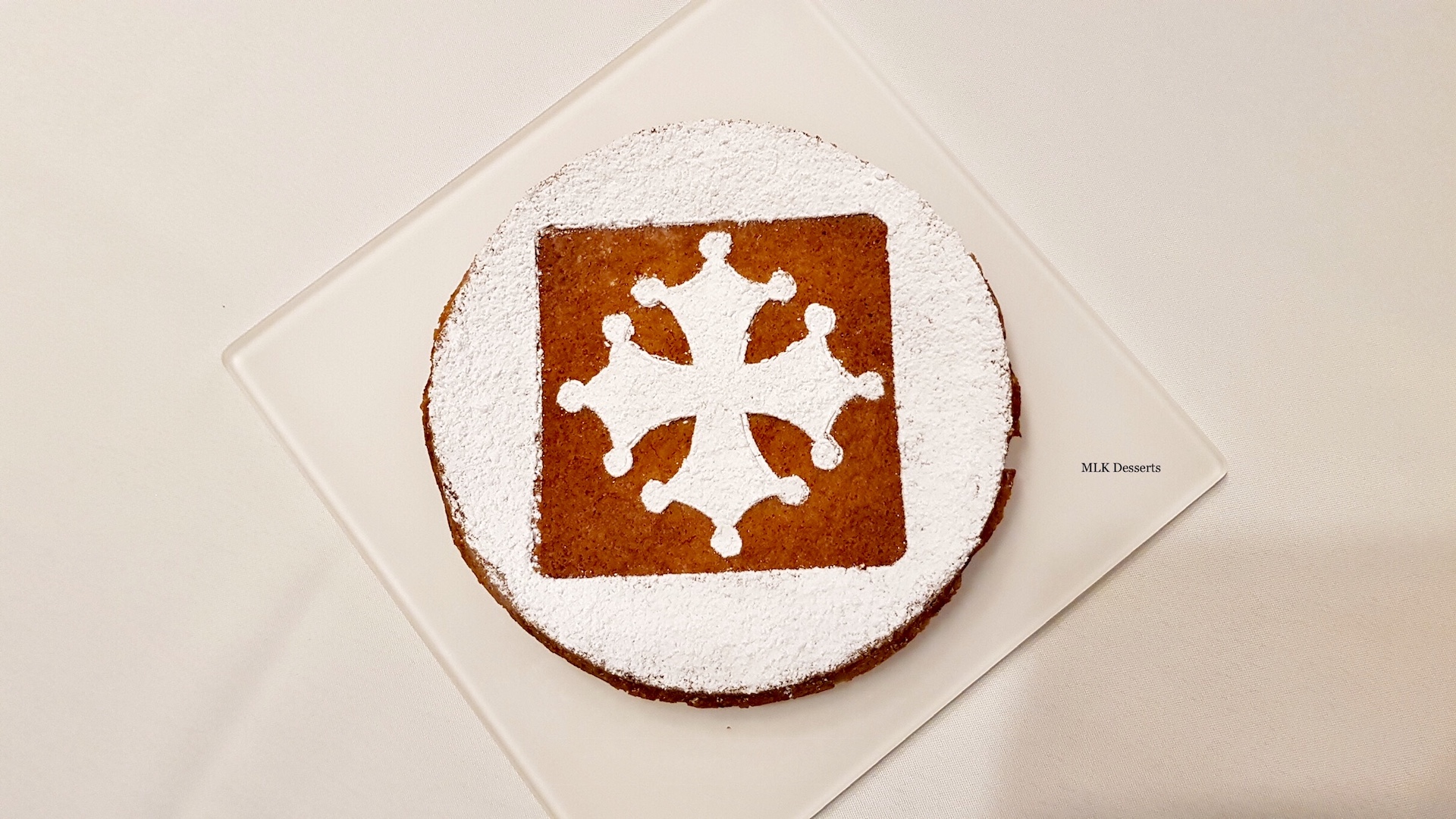 Elle se compose de deux disques de pâte sablée et entre ces deux disques on retrouvera une crème vanille, des quartiers de pommes Golden puis en décoration une croix occitane réalisée à l’aide d’un pochoir.