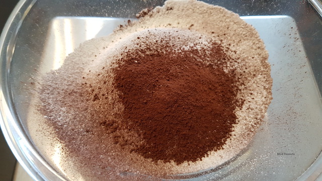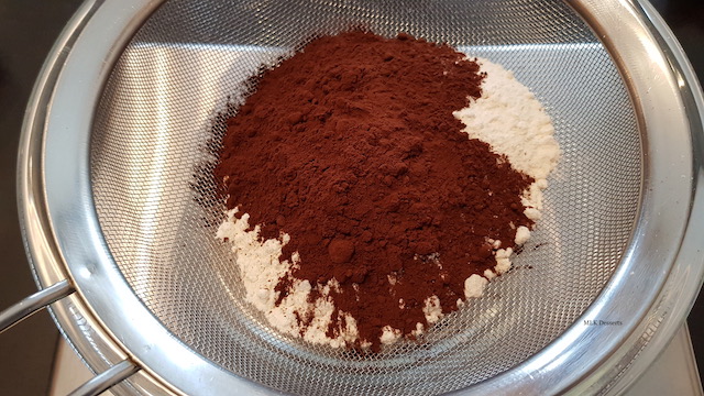 Ôter le bol du robot et foisonner la préparation à l’aide d’une maryse pendant 10 minutes afin d’alléger et augmenter le volume. Tamiser la farine, le cacao non sucré et la levure chimique, ensemble.