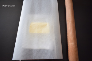 Taper le beurre à l’aide d’un rouleau à pâtisserie pour l’attendrir. Étalez-le à l’aide du rouleau à pâtisserie afin de lui donner une forme carré de 20 x20 cm. Réservez-le au réfrigérateur juste le temps de dégazer la pâte (détrempe) que vous avez réalisé la veille.