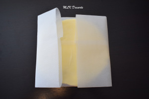 Retourner votre feuille de papier cuisson, enfin d’éviter que votre beurre soit en contact avec l’encre.  Déposer le beurre au centre de la feuille, refermer et retournez-le.