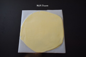 Sortir votre détrempe du réfrigérateur et dégazez-la (sur le plan de travail) avec les mains tout puis former un rectangle de +/- 40 x 30 cm à l’aide d’un rouleau à pâtisserie.
