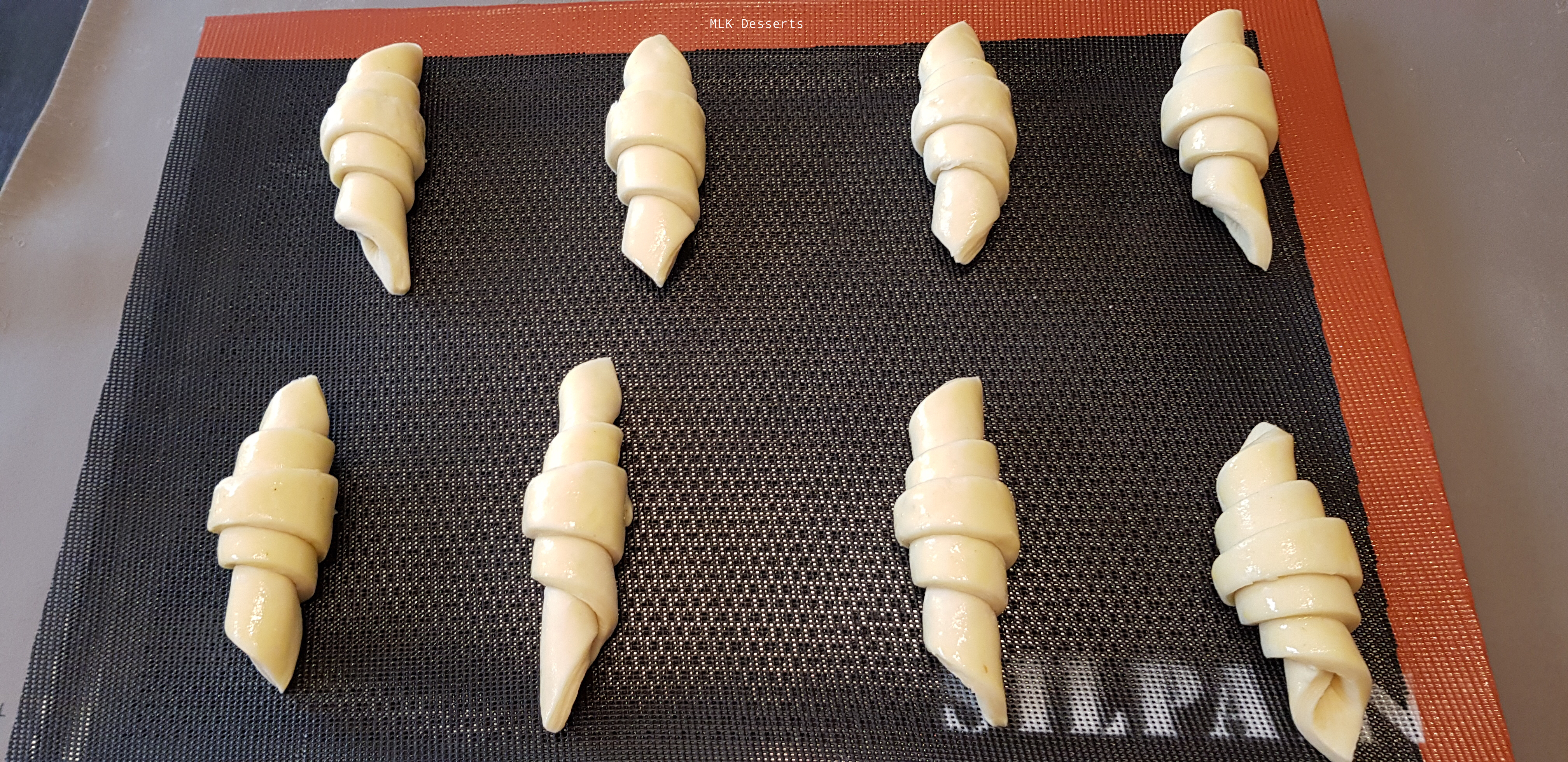 Prendre un triangle de pâte et étirer légèrement la pointe (délicatement sans la déchirer). Positionner la pointe vers vous et faites-le rouler vers vous avec vos 2 mains sans l’écraser (en partant en même temps vers la droite et vers à gauche, je ne sais pas si vous me comprenez bien 😂). Déposez-les (veiller à ce que la pointe soit en dessous) sur une plaque de cuisson recouverte d’un tapis silpain ou d’une feuille de papier cuisson. Dorez-les à l’aide d’un pinceau une première fois avec un œuf entier battu. Déposer un film alimentaire par dessus afin d’éviter qu’ils ne se dessèchent.
