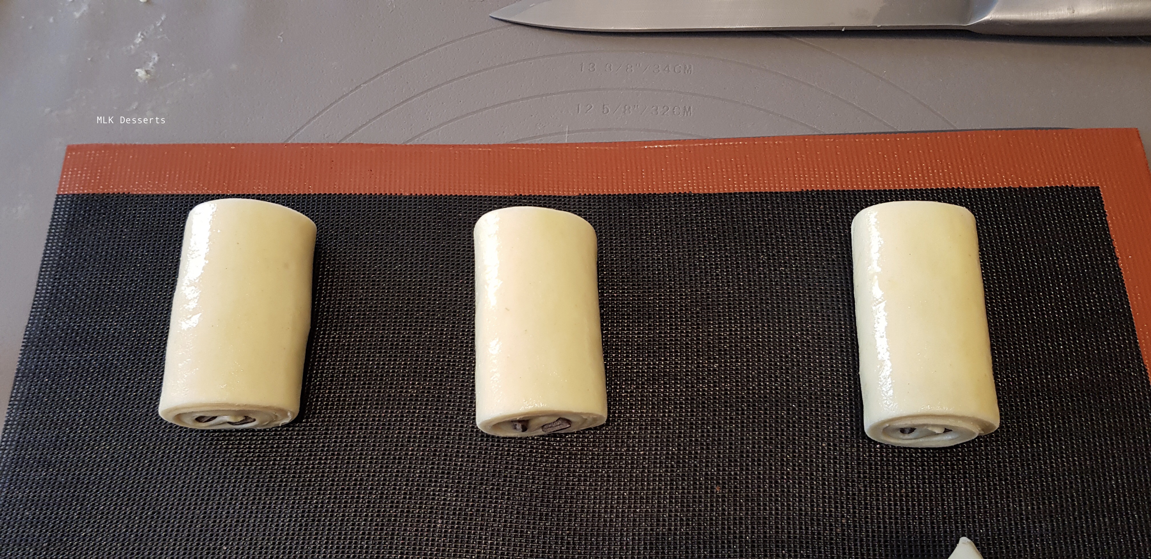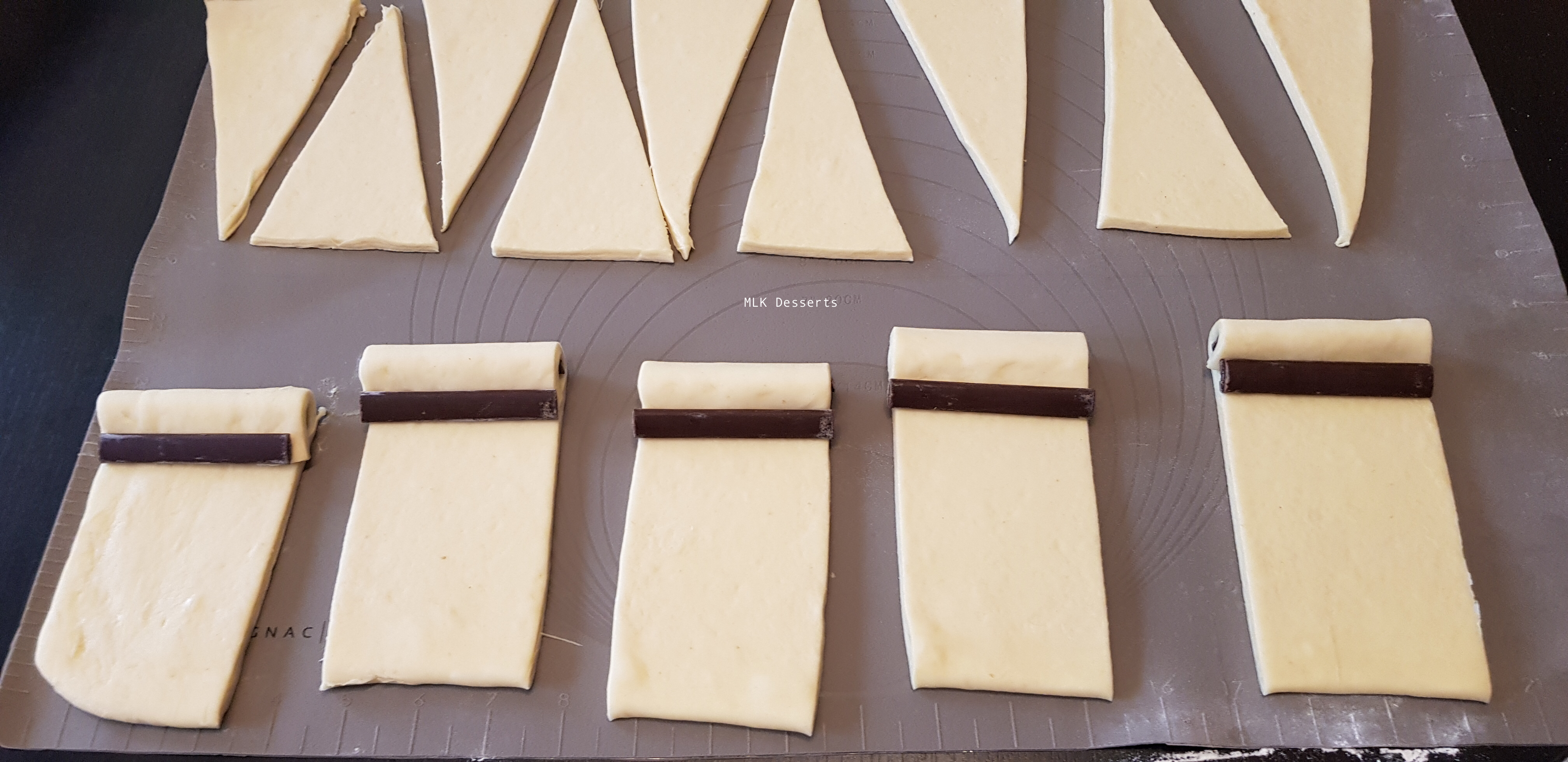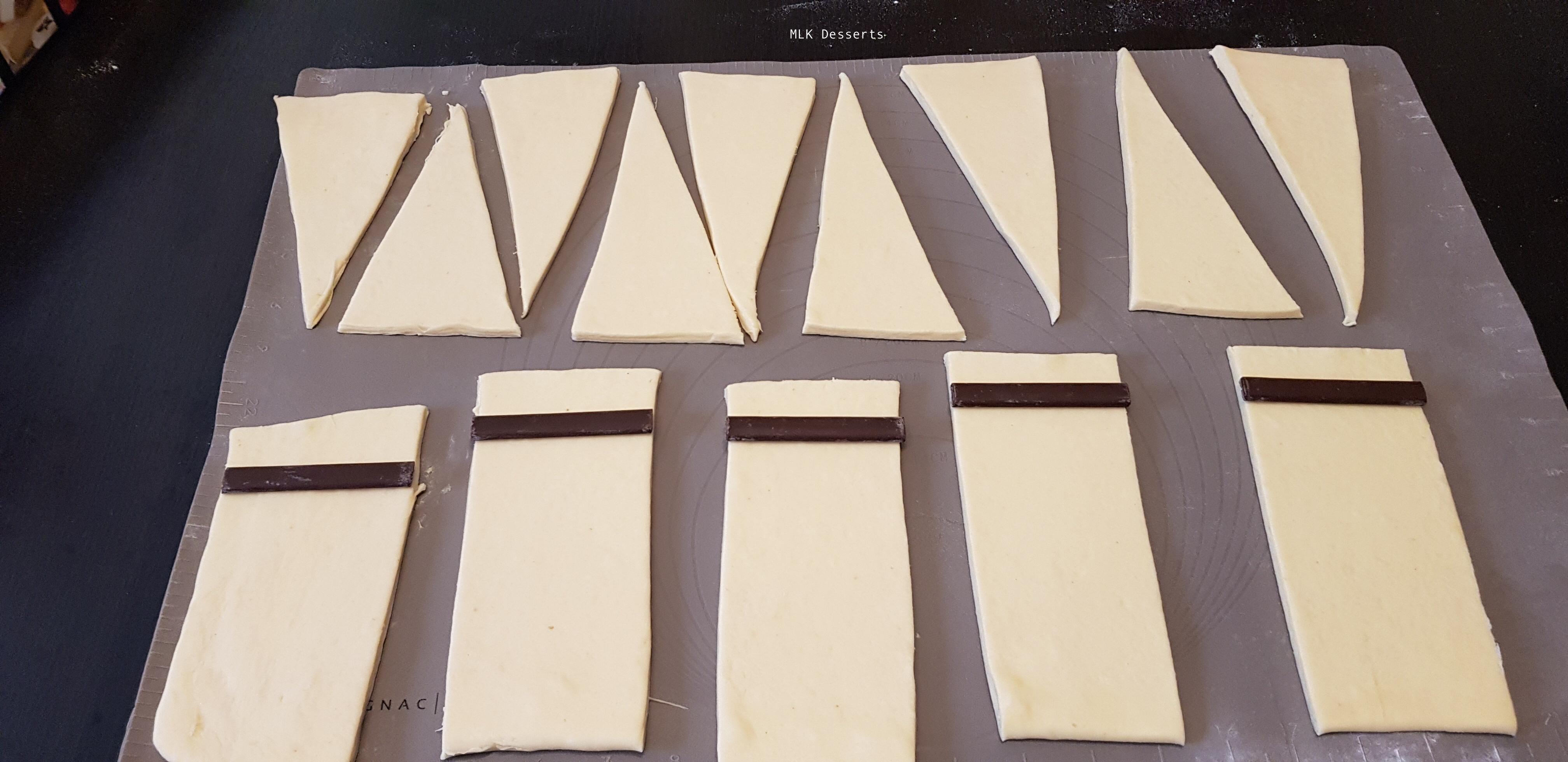 Voilà en image les entailles de 2 cm à la base des triangles pour les croissants, ce n'est pas une image récente, j'ai oublié de prendre des photos pour cette recette