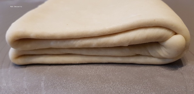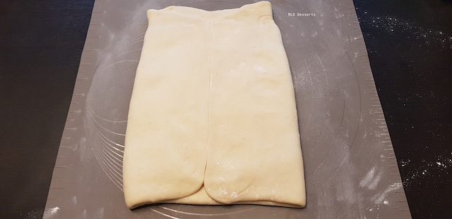 Sortir votre pâte du réfrigérateur, fariner légèrement votre plan de travail. Déposer votre pâte coté ouverture à droite. A l’aide du rouleau à pâtisserie faites des vagues sur la pâte sans pour autant l’écraser (c’est simplement pour pouvoir l’étaler plus facilement). Etalez-la en un rectangle 2 à 3 fois plus long que large en essayant de garder un rectangle régulier. Rabattre 1 tiers de la partie inférieure sur la pâte et ensuite recouvrir du tiers restant.