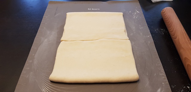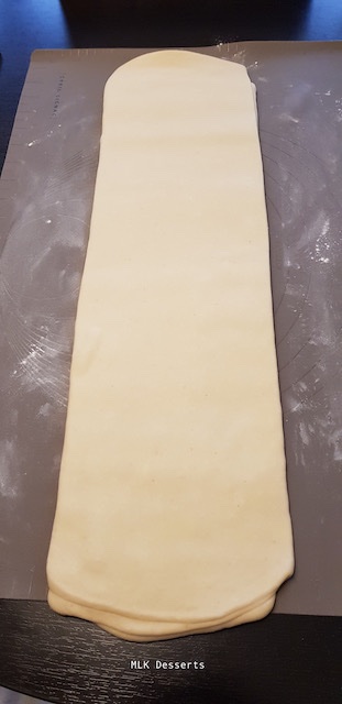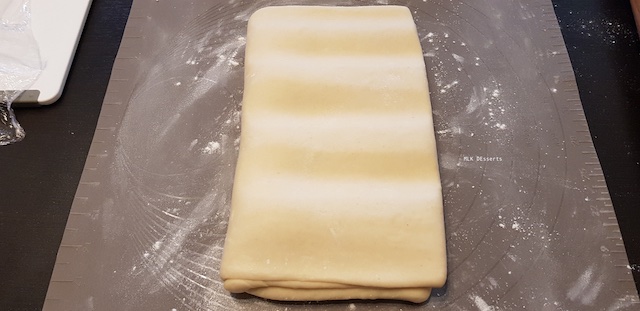 Vu de profil du tour simple terminé. Filmer et réserver au réfrigérateur pendant 1 heure minimum avant de façonner les croissants et pains au chocolat.