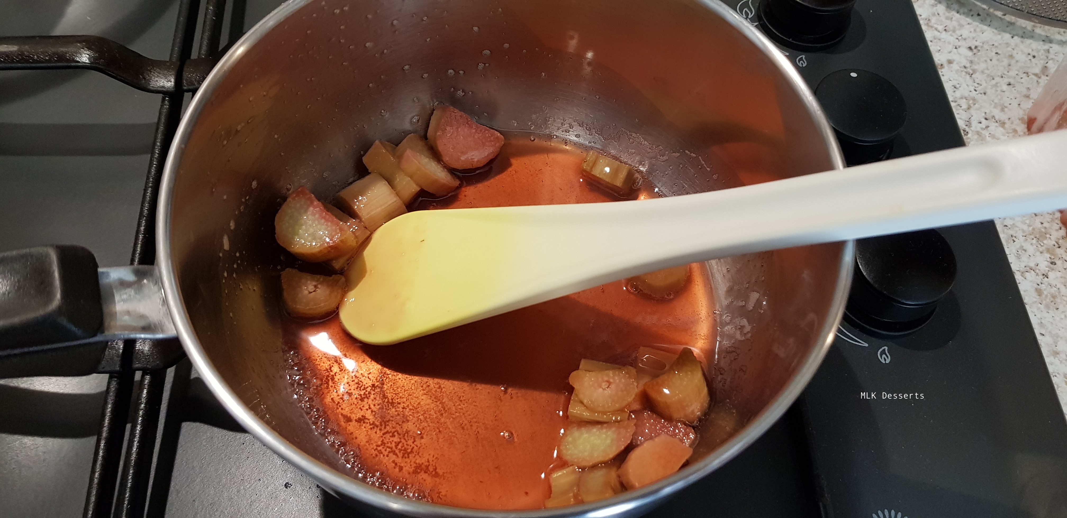 Laver la rhubarbe et épluchez-la. Coupez-la en tronçons (ma casserole fait 20 cm de diamètre). Verser le jus de fraise dans la casserole, ajouter les tronçons de rhubarbe et faites bouillir. Stopper le feu et couvrir la rhubarbe avec un disque de papier cuisson (que vous aurez découpé au préalable à la taille de la casserole) afin de conserver toute la chaleur.