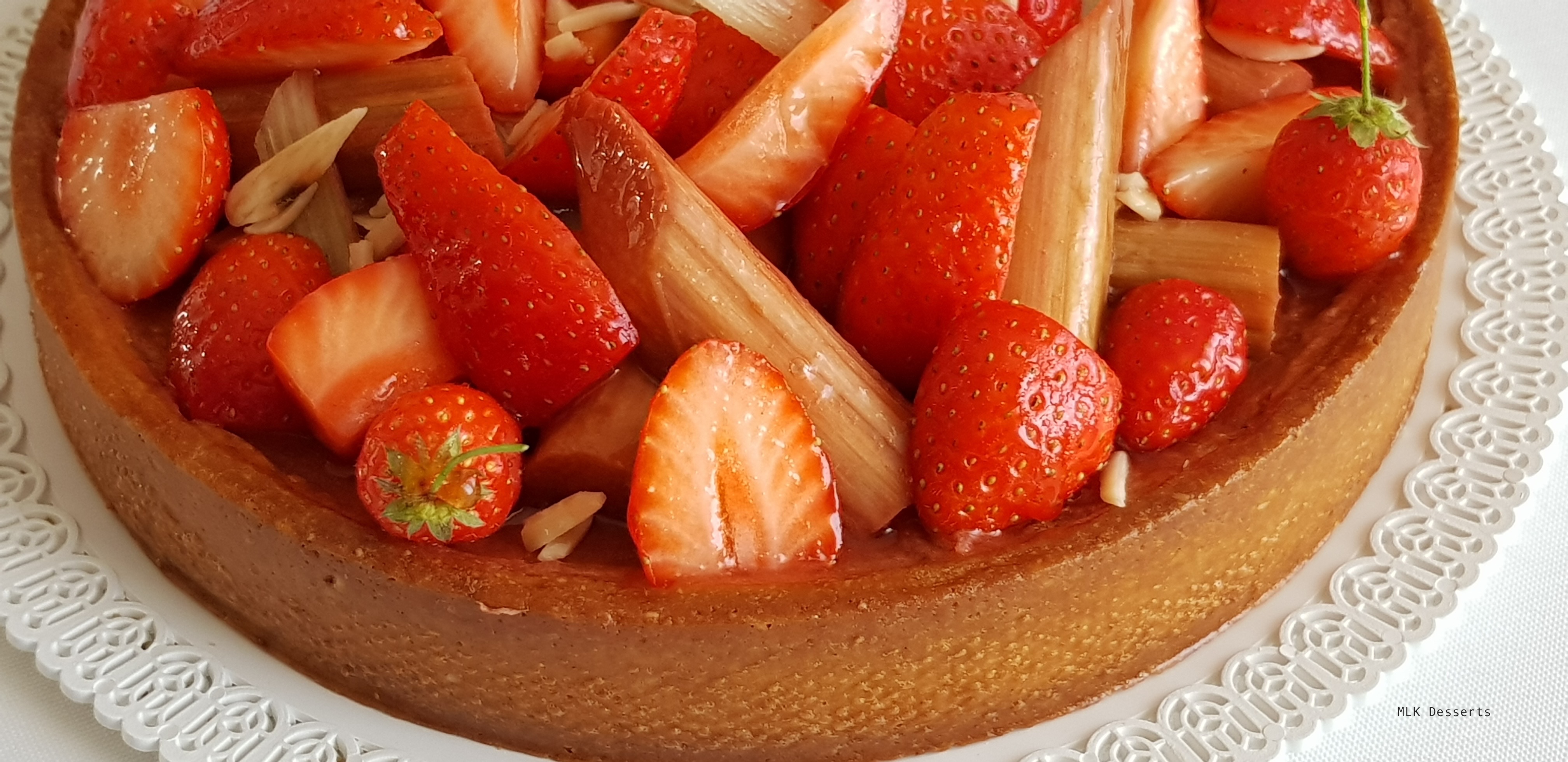 Elle se compose d’une pâte sucrée amandes, d’une crème d’amande, d’une marmelade de rhubarbe, en décor des bâtonnets amandes, des tronçons de rhubarbes pochées dans un jus de fraises, de rhubarbe crue et des fraises.