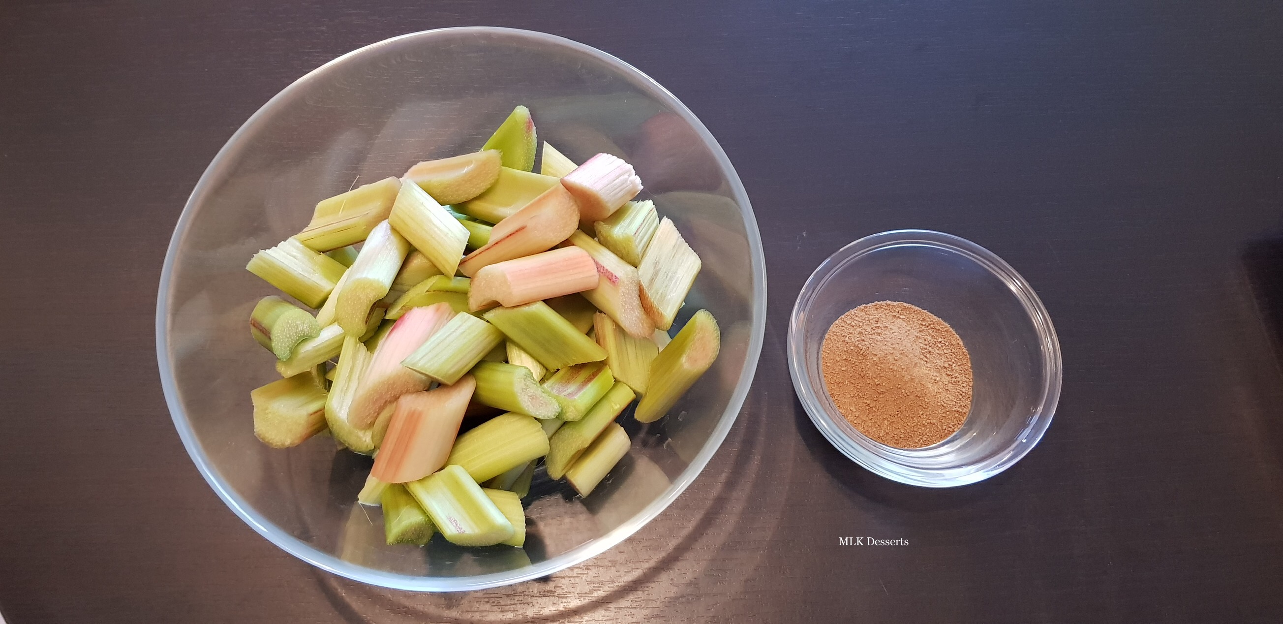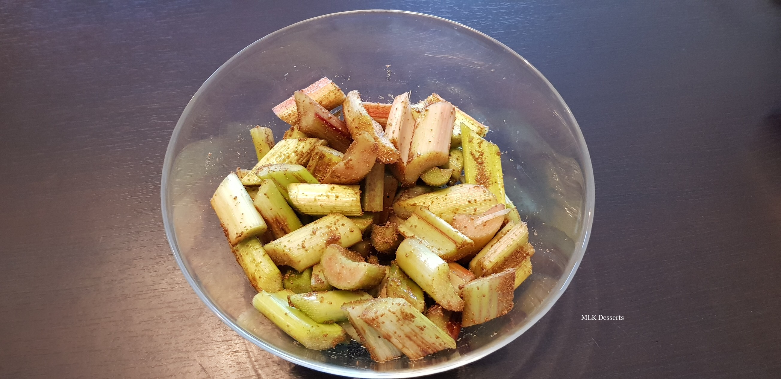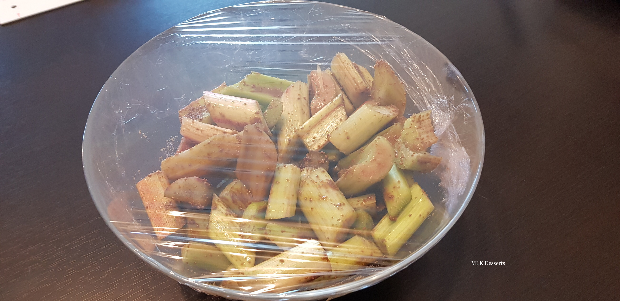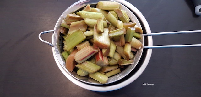 Pour la préparation de la rhubarbe, vous pouvez la réaliser la veille, elle dégorgera toute la nuit au réfrigérateur.