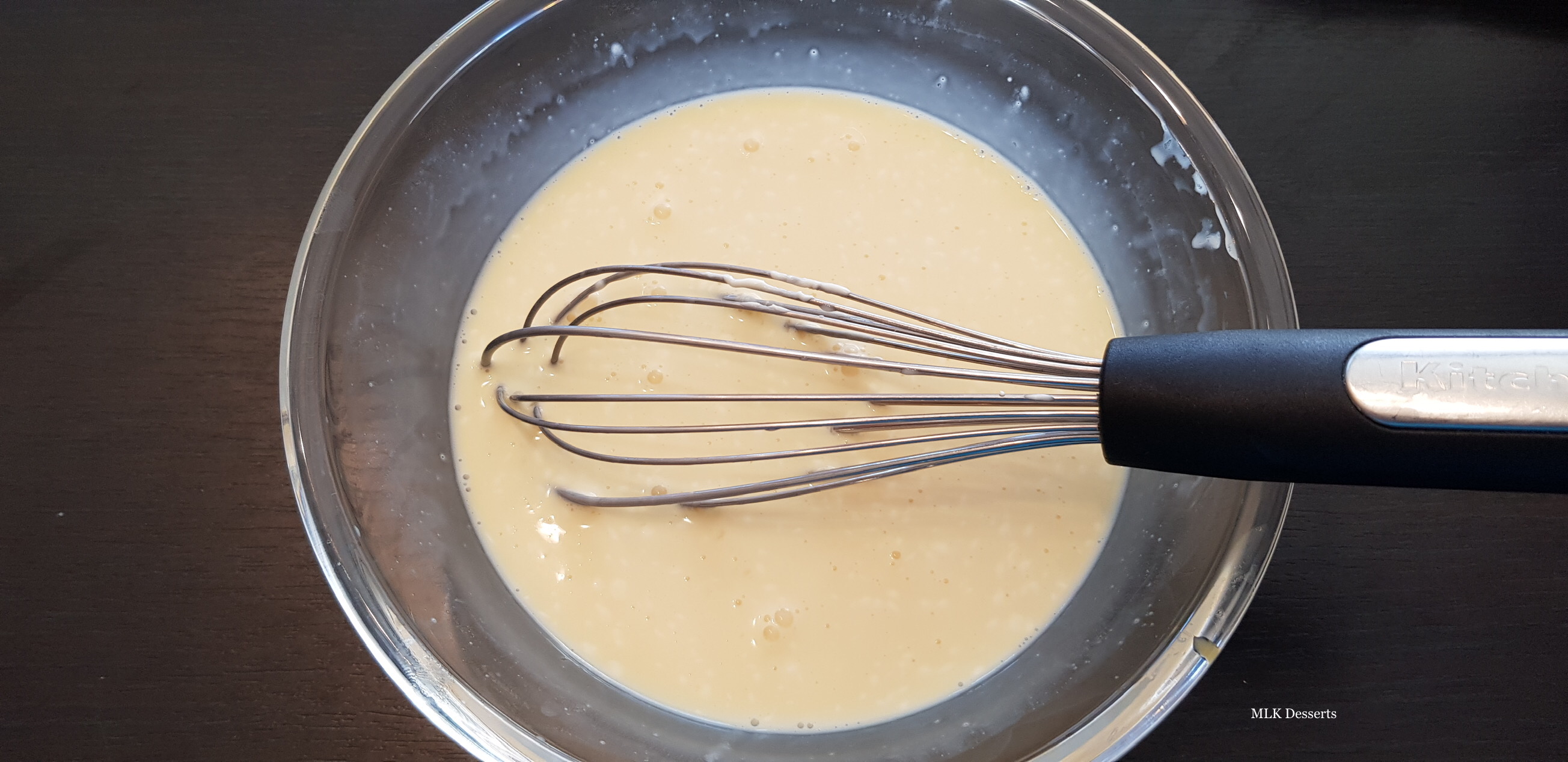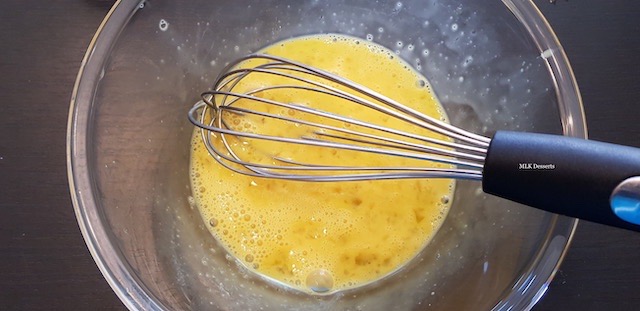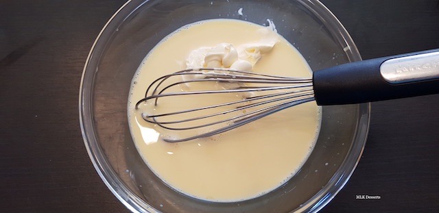 Verser le lait dans les œufs entiers battu petit à petit tout en mélangeant sans arrêt à l’aide d’un fouet. Ajouter la crème fraîche tout en mélangeant à l’aide d’un fouet.