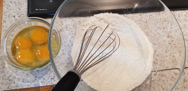 En parallèle dans un bol,  mélanger ensemble la farine et le sucre à l’aide d’un fouet. Ajouter en une seul fois les œufs entiers et les jaunes d’œufs légèrement battus. Mélanger à l’aide d’un fouet.