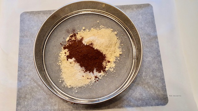 Mixer ensemble la poudre d’amande et le sucre(¹). Tamiser le mélange mixer avec le cacao non sucré sur une feuille de papier cuisson. Réserver de coté.
