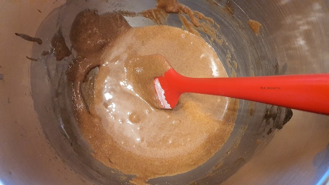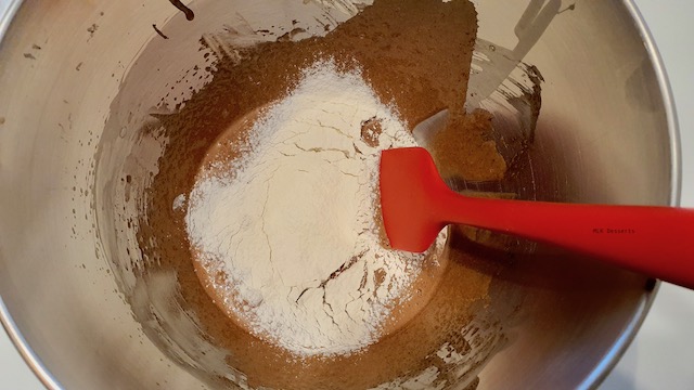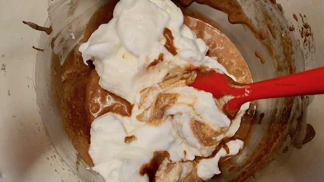 Prélever une à deux cuillères à soupe de l’appareil et ajouter le beurre fondu et mélanger délicatement à l’aide d’une maryse. Dans le reste de l’appareil, ajouter la farine tamisée et mélanger délicatement à l’aide d’une maryse puis ajouter le mélange précédent et pour ne pas changer mélanger à nouveau.