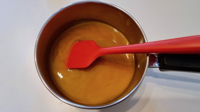 Verser le mélange eau, sucre et sirop de glucose sur le chocolat + le lait concentré non sucré et remuer à l’aide d’une maryse. Incorporer la gélatine hydratée.