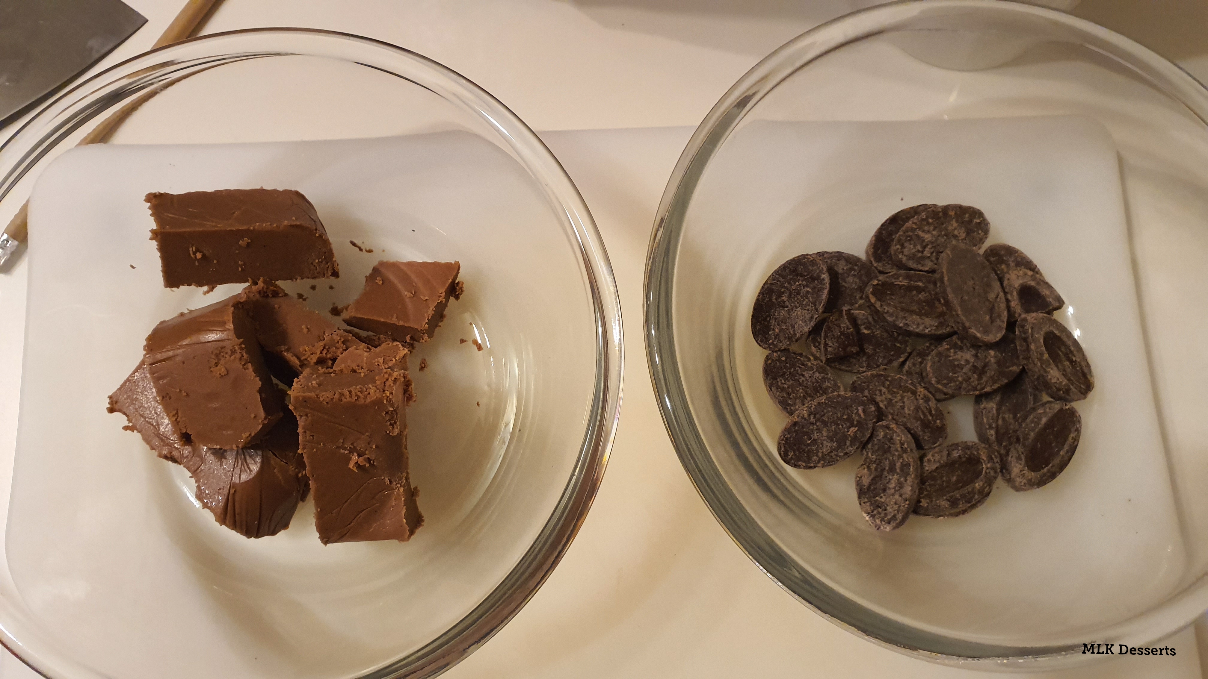 Hacher le chocolat et le gianduja et faites-les fondre au micro-ondes ou au bain-marie.