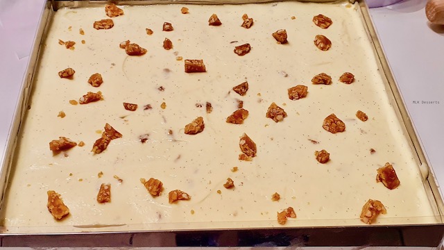 Entremet biscuit macaron amandes et crème mousseline vanille avec éclats de nougatine