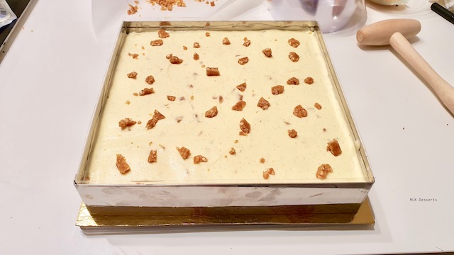 Entremet biscuit macaron amandes et crème mousseline vanille avec éclats de nougatine