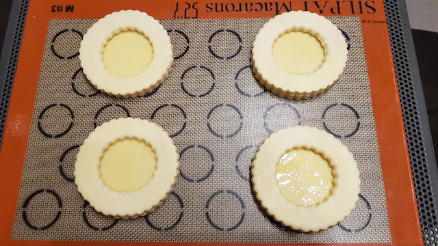 Sortir les croûtes du réfrigérateur et poser des petits cercles ou petits moule de 4,5 ou 5 cm de hauteur puis poser par dessus une plaque perforée ou classique (j’ai utilisé des moules à baba ou dariole de 4,5 cm de ∅ et 4,3 cm de hauteur que vous déposez aux 4 coins de la plaque à pâtisserie). Enfourner à four chaud à 170-180°C pendant +/- 25 à 30 minutes, au bout de 20 à 25 minutes de cuisson retirer la plaque qui se trouve sur les moules et poursuivre la cuisson encore 5 à 10 minutes (selon votre four).