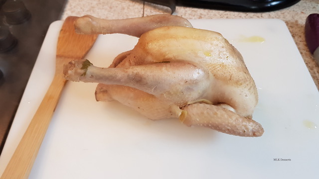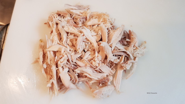 Dès que la poule est cuite, débarrassez-la sur une planche et laissez-la tiédir. Décortiquez-la et réserver les morceaux dans un saladier.